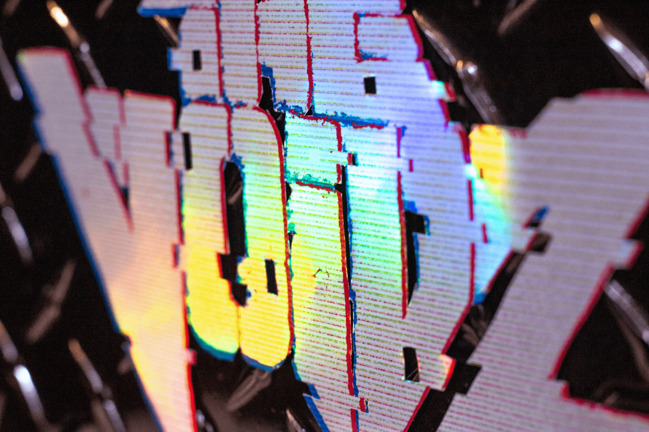 I made the logo by cutting it into a rubber block, making a print of it, and then digitally altering it to make it look glitched. I also used that technique in a lot of other places in the project.